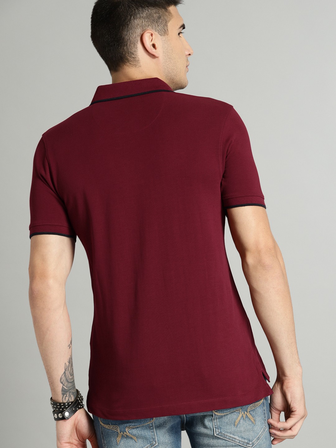 Maroon solid T-shirt, has a polo collar, short sleeves